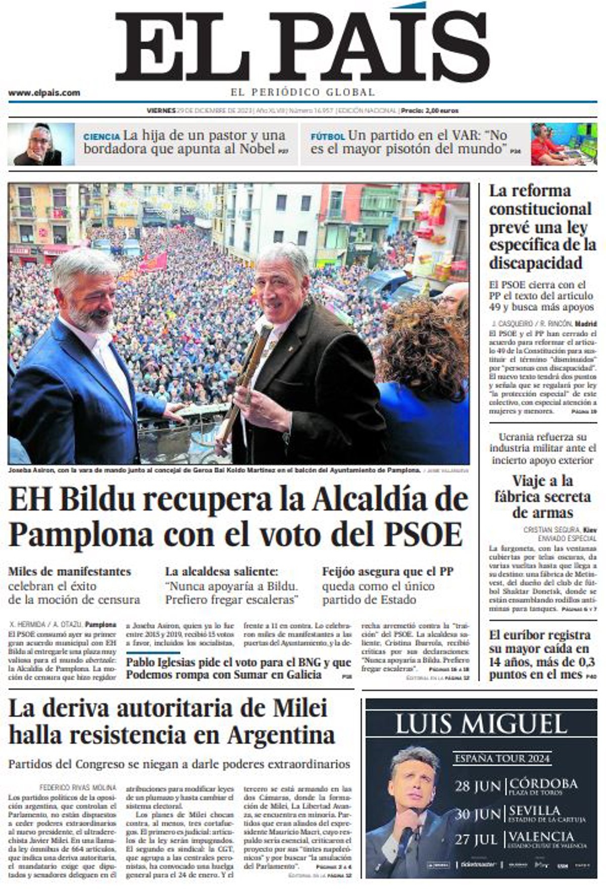 EL PAÍS: "EH Bildu recupera la Alcaldía de Pamplona con el voto del PSOE"; "La deriva autoritaria de Milei halla resistencia en Argentina"; "La reforma constitucional prevé una ley específica de la discapacidad"; "Viaje a la fábrica secreta de armas"; "El euríbor registra su mayor caída en 14 años, más de 0,3 puntos en el mes".