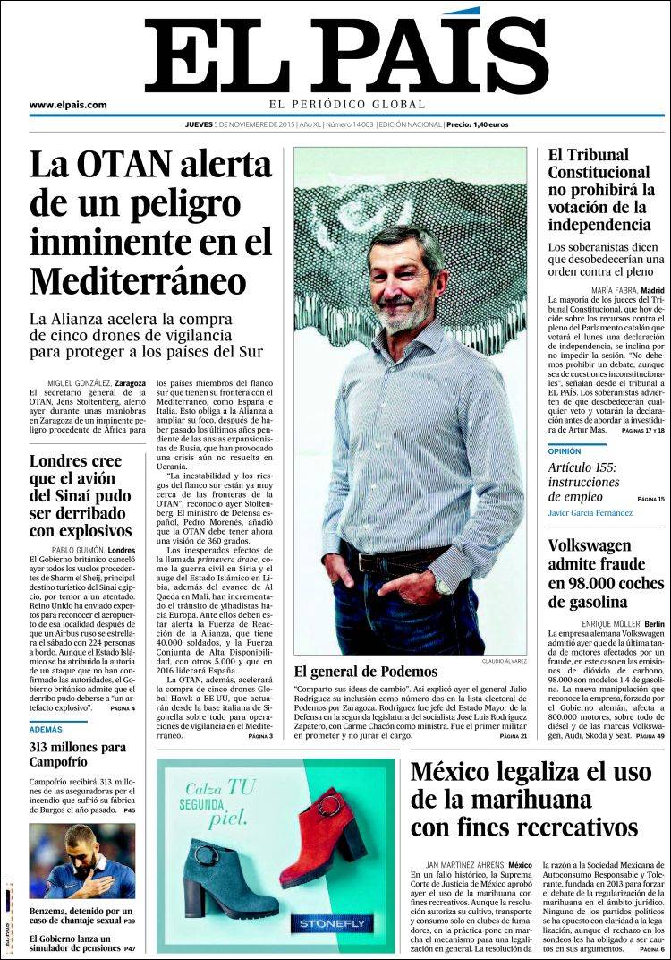 EL PAÍS: "La OTAN alerta de un peligro inminente en el Mediterráneo"; "El general de Podemos. "Comparto sus ideas de cambio". Así explicó ayer el general Julio Rodríguez su inclusión como número dos en la lista electoral de Podemos por Zaragoza"; "México legaliza el uso de la marihuana con fines recreativos"; "Londres cree que el avión del Sinaí pudo ser derribado con explosivos"; "El Tribunal Constitucional no prohibirá la votación de la independencia"; "Volkswagen admite fraude en 98.000 coches de gasolina".