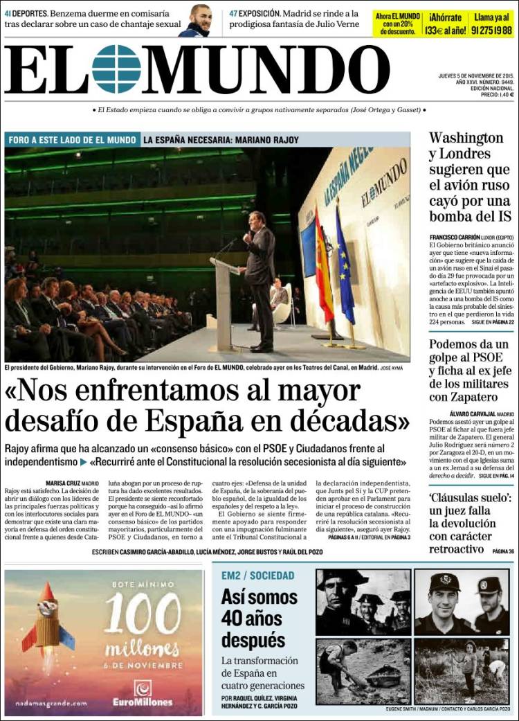 EL MUNDO: ""Nos enfrentamos al mayor desafío de España en décadas". Rajoy afirma que ha alcanzado un "consenso básico" con el PSOE y Ciudadanos frente al independentismo"; "Washington y Londres sugieren que el avión ruso cayó por una bomba del IS"; "Podemos da un golpe al PSOE y ficha al ex jefe de los militares con Zapatero"; "'Cláusulas suelo': un juez falla la devolución con carácter retroactivo".