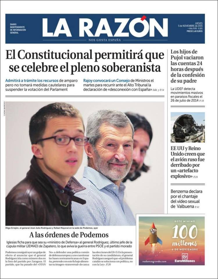 LA RAZÓN: "El Constitucional permitirá que se celebre el pleno soberanista"; "A las órdenes de Podemos. Iglesias ficha para que sea su "ministro de Defensa" al general Rodríguez, último jefe de la cúpula militar (JEMAD) de Zapatero"; "Los hijos de Pujol vaciaron las cuentas 24 horas después de la confesión de su padre"; "EE UU y Reino Unido creen que el avión ruso fue derribado por un "artefacto explosivo""; "Benzema declara por el chantaje del vídeo sexual de Valbuena".
