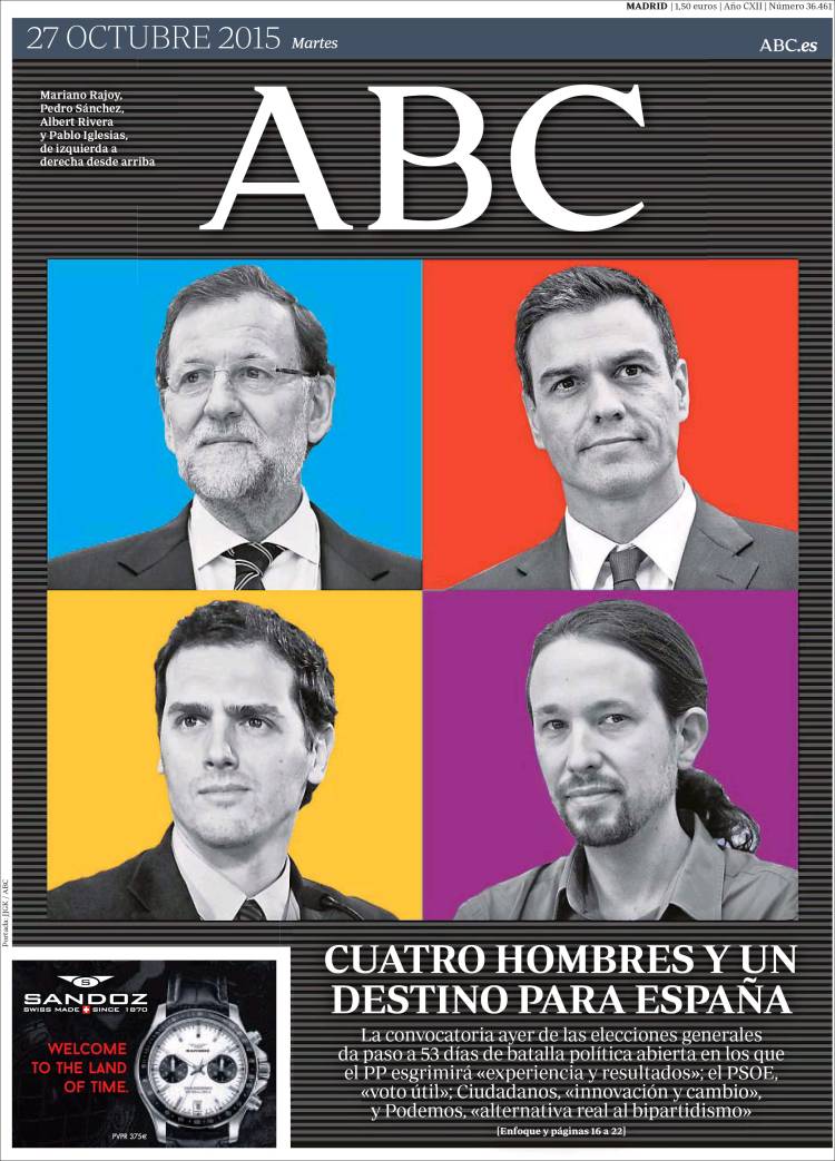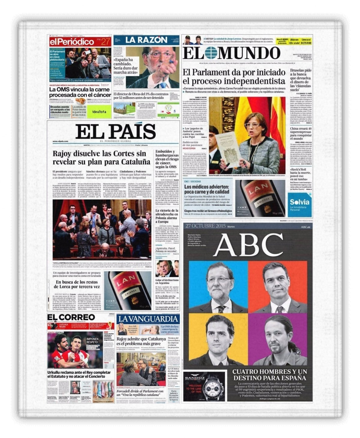 EL PAÍS: "Rajoy disuelve las Cortes sin revelar su plan para Cataluña"; "¡Viva la República catalana!'. La expresidenta de la ANC Carme Forcadell se convirtió ayer en presidenta del Parlament"; "En busca de los restos de Lorca por tercera vez"; "Embutidos y hamburguesas elevan el riesgo de cáncer, según la OMS"; "La victoria de la ultraderecha en Polonia alarma a Europa".