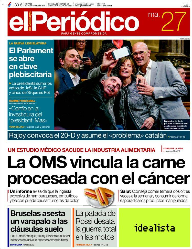 EL PERIÓDICO: "El Parlament se abre en clave plebiscitaria"; "Rajoy convoca el 20-D y asume el 'problema' catalán"; "La OMS vincula la carne procesada con el cáncer"; "Bruselas asesta un varapalo a las cláusulas suelo".