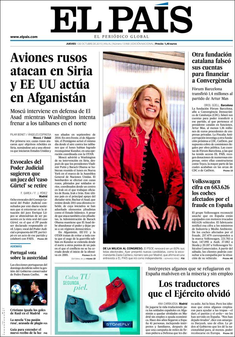 EL PAÍS: "Aviones rusos atacan en Siria y EE UU actúa en Afganistán"; "De la milicia al Congreso. El PSOE presenta como nueva candidata a la excomandante Zaida Cantera"; "Los traductores que el Ejército olvidó"; "Otra fundación catalana falseó sus cuentas para financiar a Convergència"; "Exvocales del Poder Judicial sugieren que un juez del 'caso Gürtel' se retire"; "Volkswagen cifra en 683.626 los coches afectados por el fraude en España".