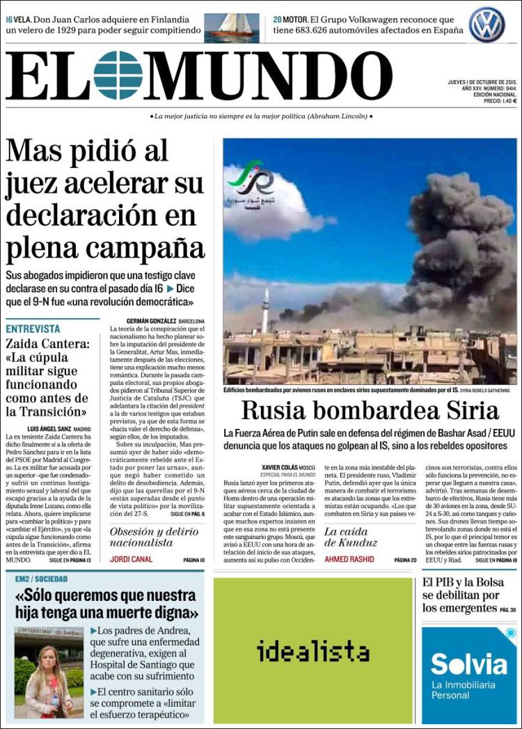 EL MUNDO: "Mas pidió al juez acelerar su declaración en plena campaña"; "Rusia bombardea Siria"; "Zaida Cantera: 'La cúpula militar sigue funcionando como antes de la Transición".