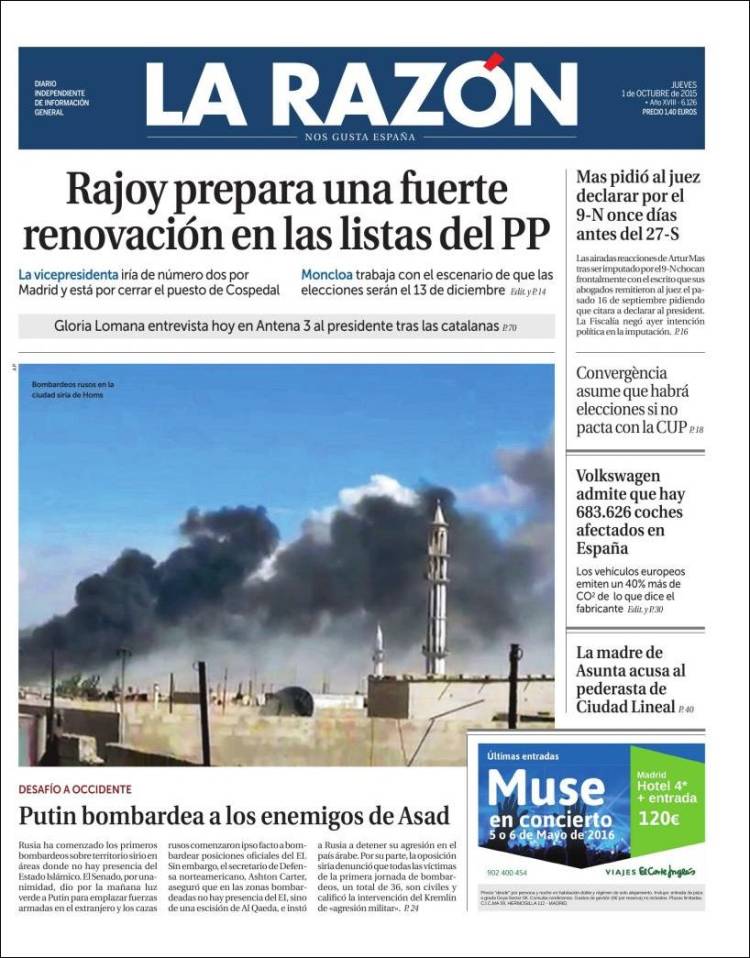 LA RAZÓN: "Rajoy prepara una fuerte renovación en las listas del PP"; "Putin bombardea a los enemigos de Asad"; "Mas pidió al juez declarar por el 9-N once días antes del 27-S"; "Volkswagen admite que hay 683.626 coches afectados en España"; "La madre de Asunta acusa al pederasta de Ciudad Lineal".