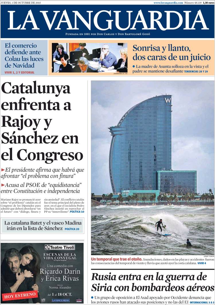 LA VANGUARDIA: "Catalunya enfrenta a Rajoy y Sánchez en el Congreso"; "Rusia entra en la guerra de Siria con bombardeos aéreos".