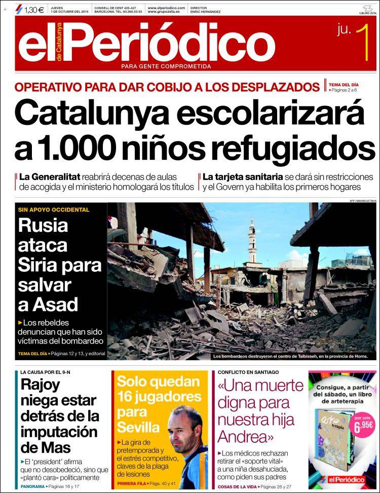 EL PERIÓDICO: "Catalunya escolarizará a 1.000 niños refugiados"; "Rusia ataca Siria para salvar a Asad"; "Rajoy niega estar detrás de la imputación de Mas".