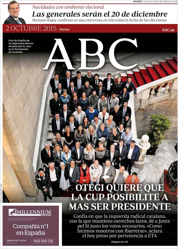 ABC: "Otegi quiere que la CUP posibilite a Mas ser presidente"; "Las generales serán el 20 de diciembre".