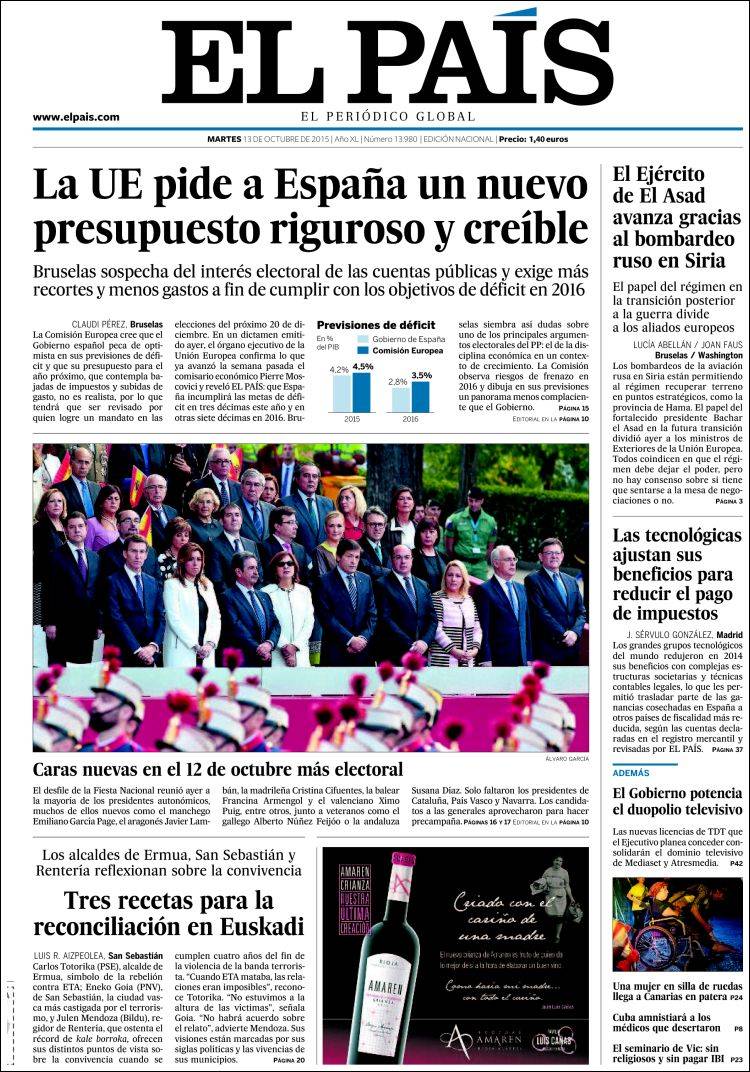 EL PAÍS: "La UE pide a España un nuevo presupuesto riguroso y creíble"; "El Ejército de El Asad avanza gracias al bombardeo ruso en Siria"; "Las tecnologías ajustas sus beneficios para reducir el pago de impuestos"; "Caras nuevas en el 12 de octubre más electoral"; "El Gobierno potencia el duopolio televisivo"; "Tres recetas para la reconciliación en Euskadi"; "Una mujer en silla de ruedas llega a Canarias en patera"; "Cuba amnistiará a los médicos que desertaron"; "El seminario de Vic: sin religiosos y sin pagar IBI".