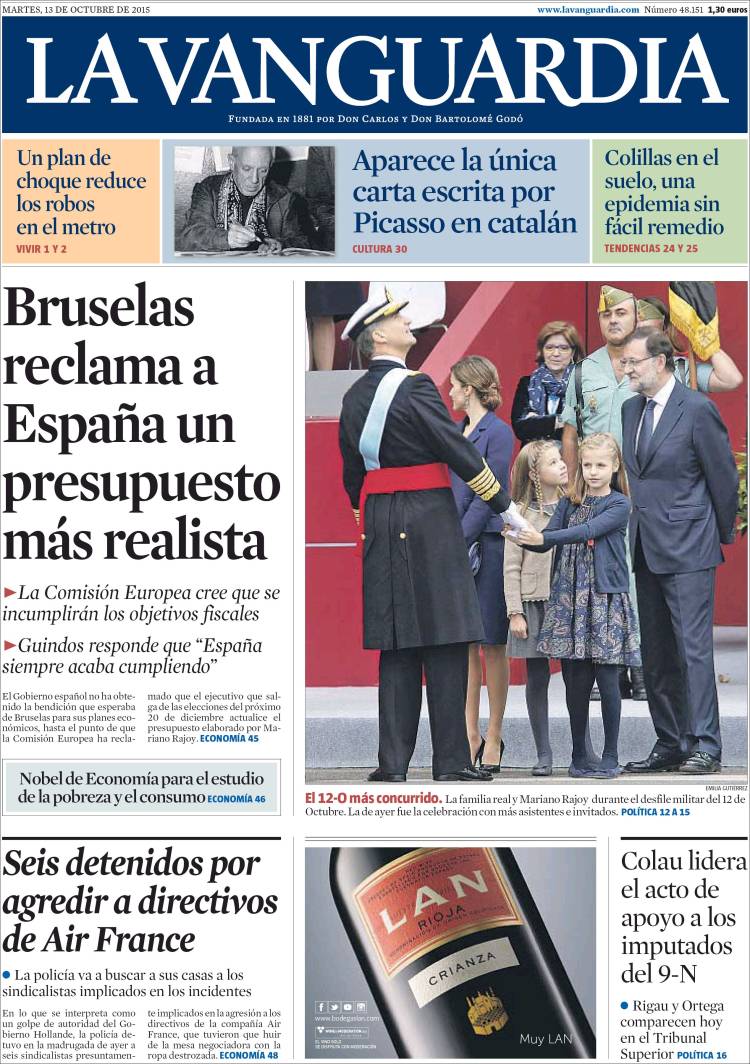 LA VANGUARDIA: "Un plan de choque reduce los robos en el metro"; "Aparece la única carta escrita por Picasso en catalán"; "Colillas en el suelo, una epidemia sin fácil remedio"; "Bruselas reclama a España un presupuesto más realista"; "Nobel de Economía para el estudio de la pobreza y el consumo"; "Siete detenidos por agredir a directivos de Air France"; "El 12-O más concurrido"; "Colau lidera el acto de apoyo a los imputados del 9-N".