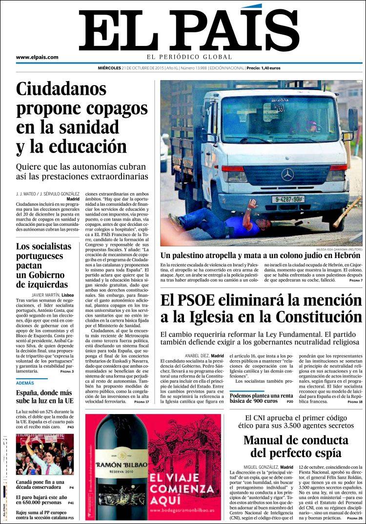 EL PAÍS: "Ciudadanos propone copagos en la sanidad y la educación"; "Un palestino atropella y mata a un colono judío en Hebrón"; "El PSOE eliminará la mención a la Iglesia en la Constitución"; "Manual de conducta del perfecto espía"; "Los socialistas portugueses pactan un Gobierno de izquierdas".