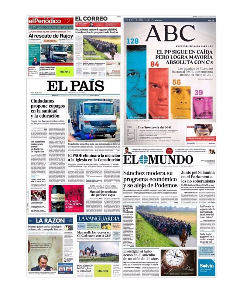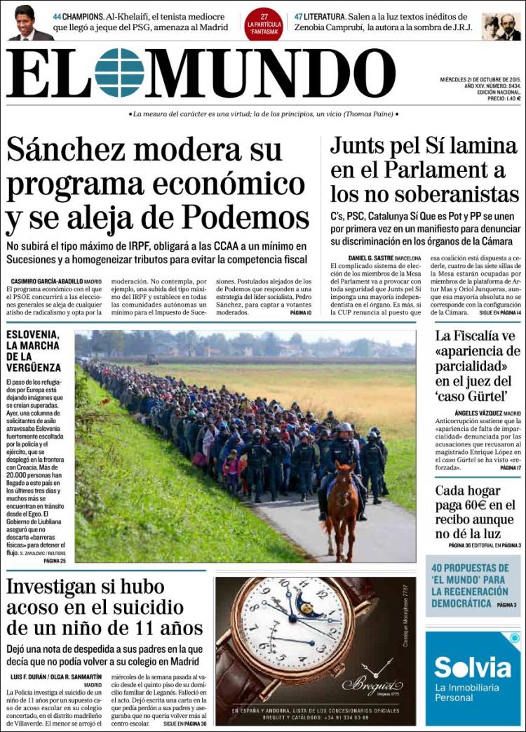 EL MUNDO: "Sánchez modera su programa económico y se aleja de Podemos"; "Eslovenia, la marcha de la vergüenza"; "Junts pel Sí lamina en el Parlament a los no soberanistas"; "La Fiscalía ve 'apariencia de parcialidad' en el juez del caso Gürtel"; "Investigan si hubo acoso en el suicidio de un niño de 11 años".