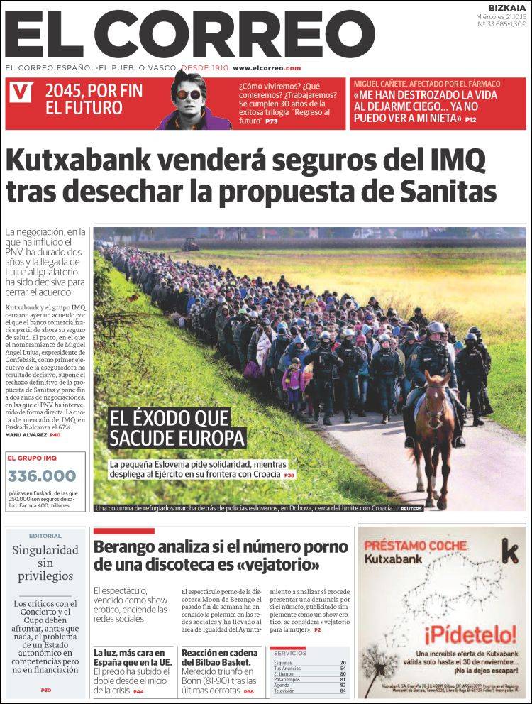 EL CORREO: "Kutxabank venderá seguros del IMQ tras desechar la propuesta de Sanitas"; "El éxodo que sacude Europa. La pequeña Eslovenia pide solidaridad, mientras despliega al Ejército en su frontera con Croacia"; "Berango analiza si el número porno de una discoteca es 'vejatorio".