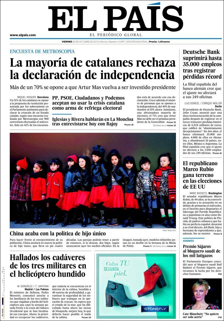 EL PAÍS: "La mayoría de catalanes rechaza la declaración de independencia. PP, PSOE, Ciudadanos y Podemos aceptan no usar la crisis catalana como arma de refriega electoral"; "Iglesias y Rivera hablarán en La Moncloa tras entrevistarse hoy con Rajoy"; "China acaba con la política de hijo único"; "Hallados los cadáveres de los tres militares en el helicóptero hundido"; "Deutsche Bank suprimirá hasta 35.000 empleos tras registrar pérdidas récord"; "El republicano Marco Rubio gana terreno en las elecciones de EE UU"; "Premio Sájarov al bloguero saudí de los mil latigazos".