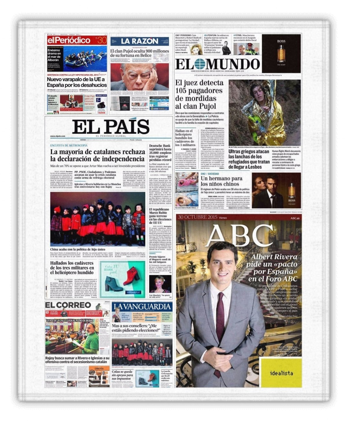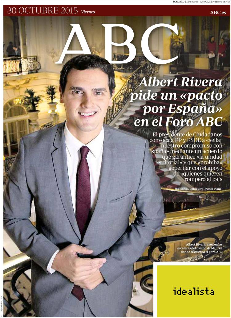 ABC: "Albert Rivera pide un "pacto por España". El presidente de Ciudadanos convoca a PP y PSOE a "sellar nuestro compromiso con España" mediante un acuerdo que garantice "la unidad territorial" y que "prohíba" gobernar con el apoyo de "quienes quieren romper" el país".