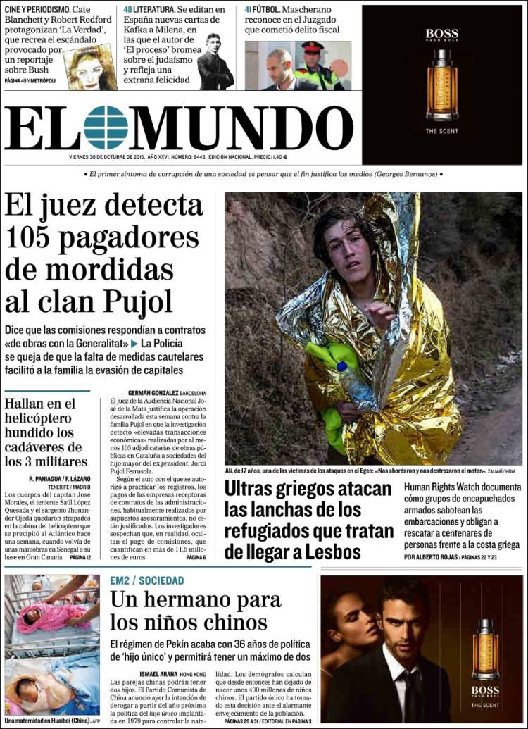 EL MUNDO: "El juez detecta 105 pagadores de mordidas al clan Pujol"; "Ultras griegos atacan las lanchas de los refugiados que tratan de llegar a Lesbos"; "Hallan en el helicóptero hundido los cadáveres de los 3 militares"; "Un hermano para los niños chinos. El régimen de Pekín acaba con 36 años de política de 'hijo único' y permitirá tener un máximo de dos".