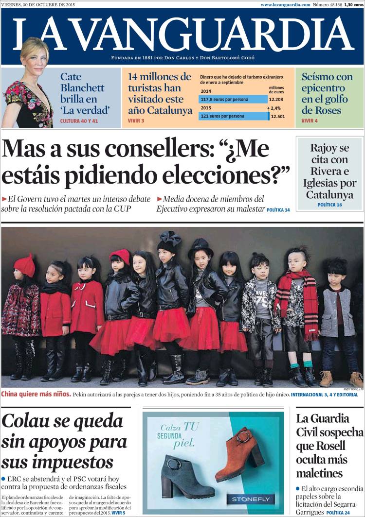 LA VANGUARDIA: "Mas a sus consellers: "¿Me estáis pidiendo elecciones?. Rajoy se cita con Rivera e Iglesias por Catalunya"; "China quiere más niños. Pekín autorizará a las parejas a tener dos hijos, poniendo fin a 35 años de política de hijo único"; "Colau se queda sin apoyos para sus impuestos"; "La Guardia Civil sospecha que Rosell oculta más maletines".