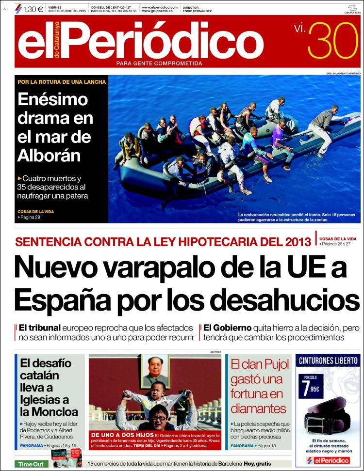 EL PERIÓDICO: "Enésimo drama en el mar de Alborán. Cuatro muertos y 35 desaparecidos al naufragar una patera"; "Nuevo varapalo de la UE a España por los desahucios"; "El desafío catalán lleva a Iglesias a la Moncloa"; "De uno a dos hijos. El Gobierno chino levantó ayer la prohibición de tener más de un hijo, vigente desde hace 35 años. Ahora el límite estará en dos"; "El clan Pujol gastó una fortuna en diamantes".