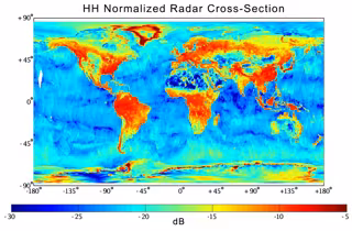 En la imagen de radar, son evidentes las condiciones de la tierra, los océanos y el hielo. Las señales de radar más débiles se miden sobre desiertos como el Sáhara o el Gobi, representados en tonos azules, reflejando así su muy bajo contenido de humedad del suelo y la falta de cobertura vegetal. Por el contrario, los bosques tropicales del Amazonas y del Congo con vegetación densa tienen señales de radar muy fuertes, representadas en rojo.