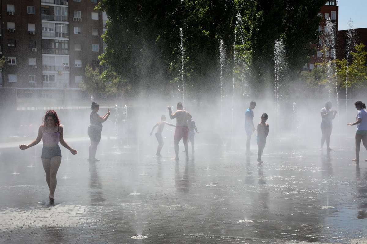 Varias personas, entre ellas niños, se refrescan en los chorros de Madrid Río un día antes de que, según la Agencia Estatal de Meteorología (AEMET), llegue a la península Ibérica y a las Islas Baleares la primera ola de calor del verano 2019. - Jesús Hellín - Europa Press