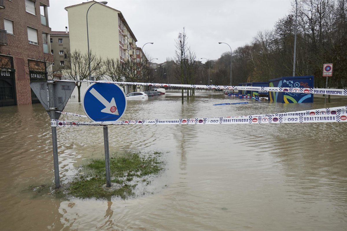 Señales de tráfico cubiertas de agua en una vía inundada del barrio de Rotxapea, a 10 de diciembre de 2021, en Pamplona, Navarra, (España). El Gobierno de Navarra ha activado el nivel de preemergencia por inundaciones con el fin de mantener una vigilanc - Eduardo Sanz - Europa Press