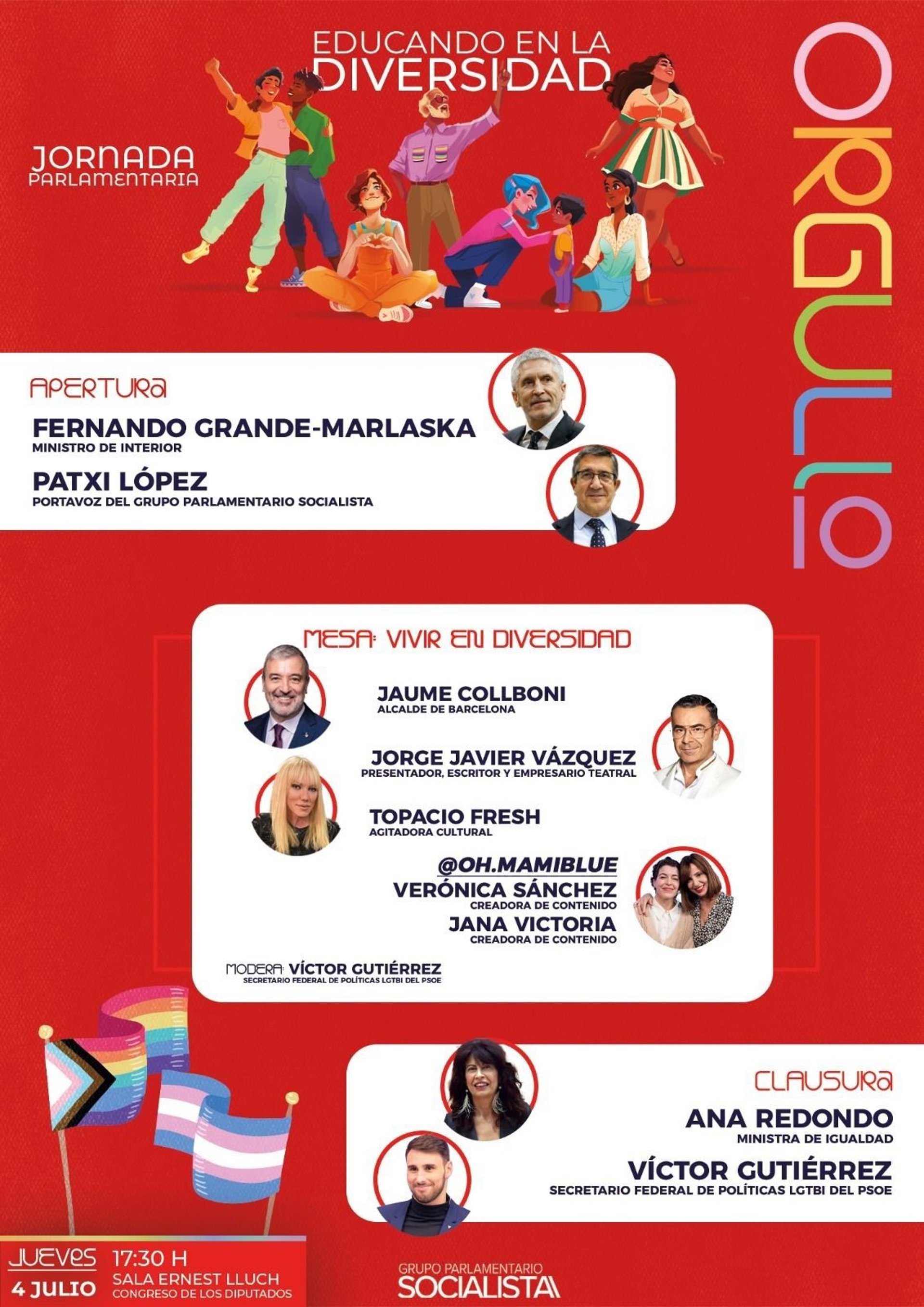 El PSOE celebrará este jueves en el Congreso la jornada parlamentaria 'Educando en la diversidad', en la que intervendrán, entre otros, el presentador de televisión Jorge Javier Vázquez y la cantante y actriz Topacio Fresh, coincidiendo con la semana en la que se celebra el Orgullo LGTBI en Madrid.