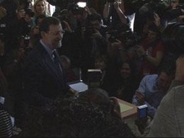 Rajoy fue escoltado a la salida del colegio electoral por medio centenar de participantes que le mostraron su apoyo al grito de "Mariano amigo, España está contigo". Antes de partir, el candidato popular se hizo fotos con varios simpatizantes, entre los que había niños y personas mayores.