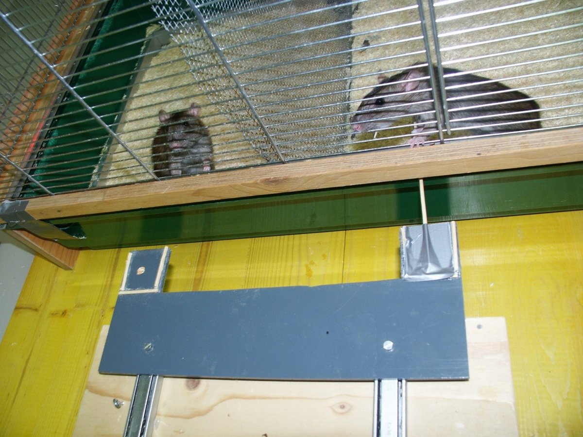 Una rata (derecha) tira de una bandeja hacia la jaula, proporcionando así acceso a los alimentos (una hojuela de avena) al interlocutor social (izquierda) en el otro compartimento de la jaula - RES SCHMID