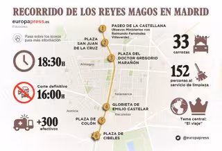 El recorrido de las carrozas que transportarán a sus majestades de Oriente será: Paseo de la Castellana (Nuevos Ministerios esquina Pza. San Juan de la Cruz), Paseo de la Castellana, Plaza del Doctor Gregorio Marañón, Paseo de la Castellana, Glorieta de Emilio Castelar, Paseo de la Castellana, Plaza de Colón y Paseo de Recoletos, según informa el Ayuntamiento de la capital en su página web.