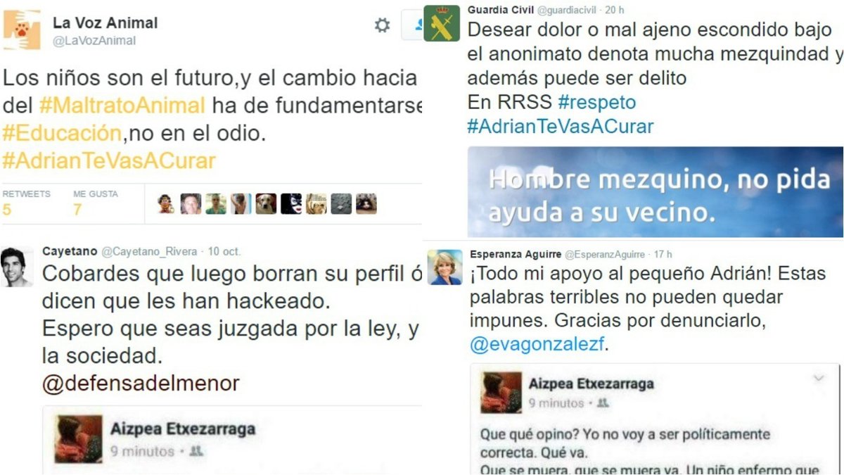 Taurinos y antitaurinos se han unido bajo la etiqueta #AdrianTeVasACurar para condenar las palabras de los usuarios que afirmaban que era un "gasto innecesario" la recuperación de Adrián ya que "quiere ser torero y corta orejas" y que deseaban "que se muera ya" por querer curarse "para matar a herbívoros inocentes y sanos que también quieren vivir".
