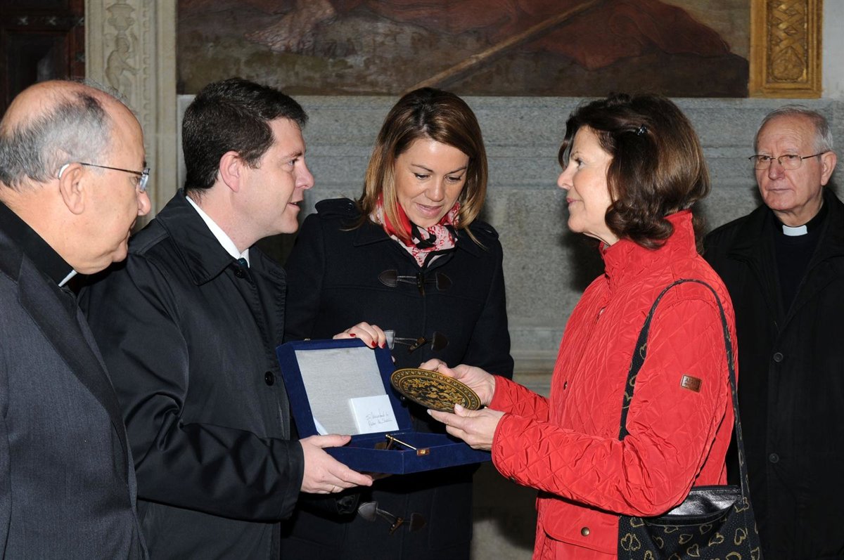 Ante la presencia del deán de la Catedral, Juan Sánchez, el alcalde y Cospedal han hecho entrega a la reina Silvia de un plato damasquinado, un obsequio del Ayuntamiento de la capital regional y de todos los toledanos.