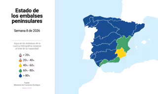 La reserva hídrica española está al 83%, con 46.494 hectómetros cúbicos (hm3), tras ganar 265 hm3 en una semana, es decir, el 0,5% de su capacidad total, según datos del Ministerio para la Transición Ecológica y el Reto Demográfico (MITECO) recogidos por Europa Press.