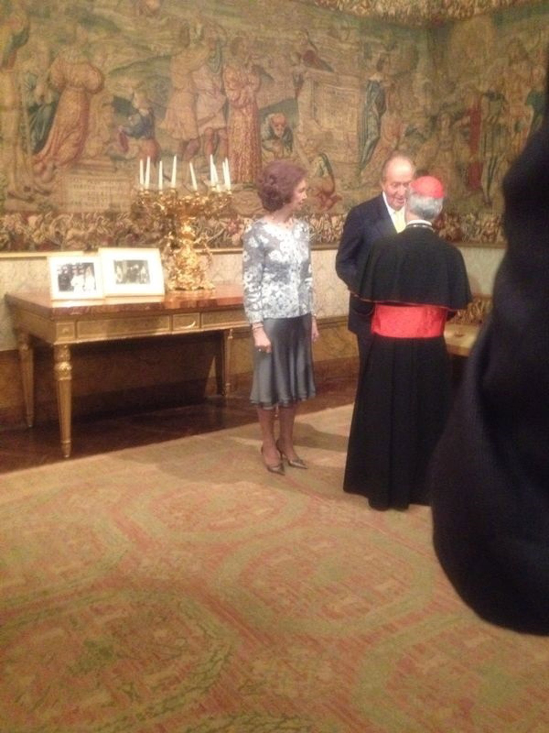 Antes de la cena, la reina Sofía y el rey Juan Carlos han saludado, uno por uno, a toda la delegación española en la que han presentes unas 40 personas, incluyendo el ministro de Asuntos Exteriores y de Cooperación español, José Manuel García-Margallo, el ministro de Justicia, Alberto Ruiz-Gallardón, y el titular de la cartera de Interior, ministro del Interior, Jorge Fernández Díaz y el exportavoz del Juan Pablo II Joaquín Navarro Vals.