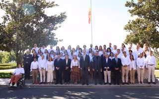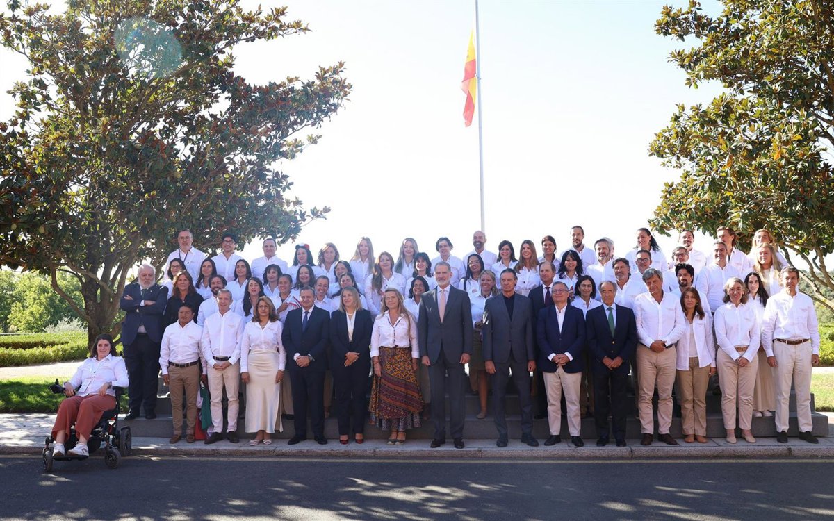 Foto de familia del Rey Felipe VI (c), junto a una representación de los participantes en el I Congreso Internacional 'Expedicionarios Miguel de la Quadra-Salcedo', en el Palacio de La Zarzuela, a 22 de septiembre de 2025, en Madrid (España). - Marta Fernández - Europa Press