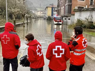 Trabajadores de Cruz Roja frente a una calle inundada, a 10 de diciembre de 2021, en Mendaro, Gipuzkoa, Euskadi (España). Las lluvias que azotan en las últimas horas y los desprendimientos de tierra han provocado que todos los accesos por carretera a es - Javi Colmenero - Europa Press