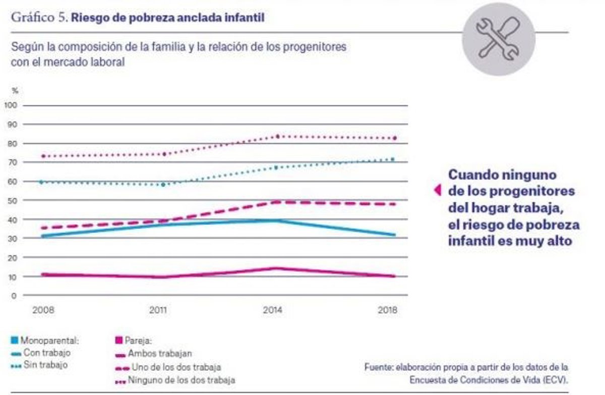 El panorama para este grupo no ha mejorado y en 2018, el 48,1 por ciento de los niños en este tipo de hogares vivían en la pobreza. Los más vulnerables son aquellos niños en familias en las que ninguno de los dos progenitores trabaja. En 2018, eran pobres ocho de cada diez menores en esta situación, frente a los siete de cada diez de 2008. A estos les siguen los niños que crecen en familias monoparentales en las que el padre o la madre no trabaja.