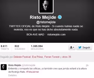El empresario y popular rostro televisivo Risto Mejide ha respondido en su cuenta de Twitter a las críticas que ha provocado su nombramiento como miembro de los jurados de los Premios Rey Jaime I. "Entiendo y comparto las críticas, yo también creo que jamás estaré a la altura de Rodrigo Rato", ironiza en la red social Risto Mejide, que ha añadido el hashtag #FelizJaimeI.