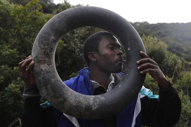 5. Pablo, también de Camerún, espera en las montañas con un flotador hecho a mano.