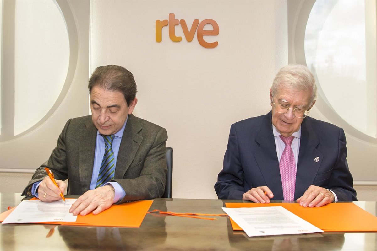 El presidente de la Real Academia de Ingeniería, Antonio Colino, y el director general corporativo de RTVE, Federico Montero, firman en Prado del Rey la renovación de su convenio. - RTVE