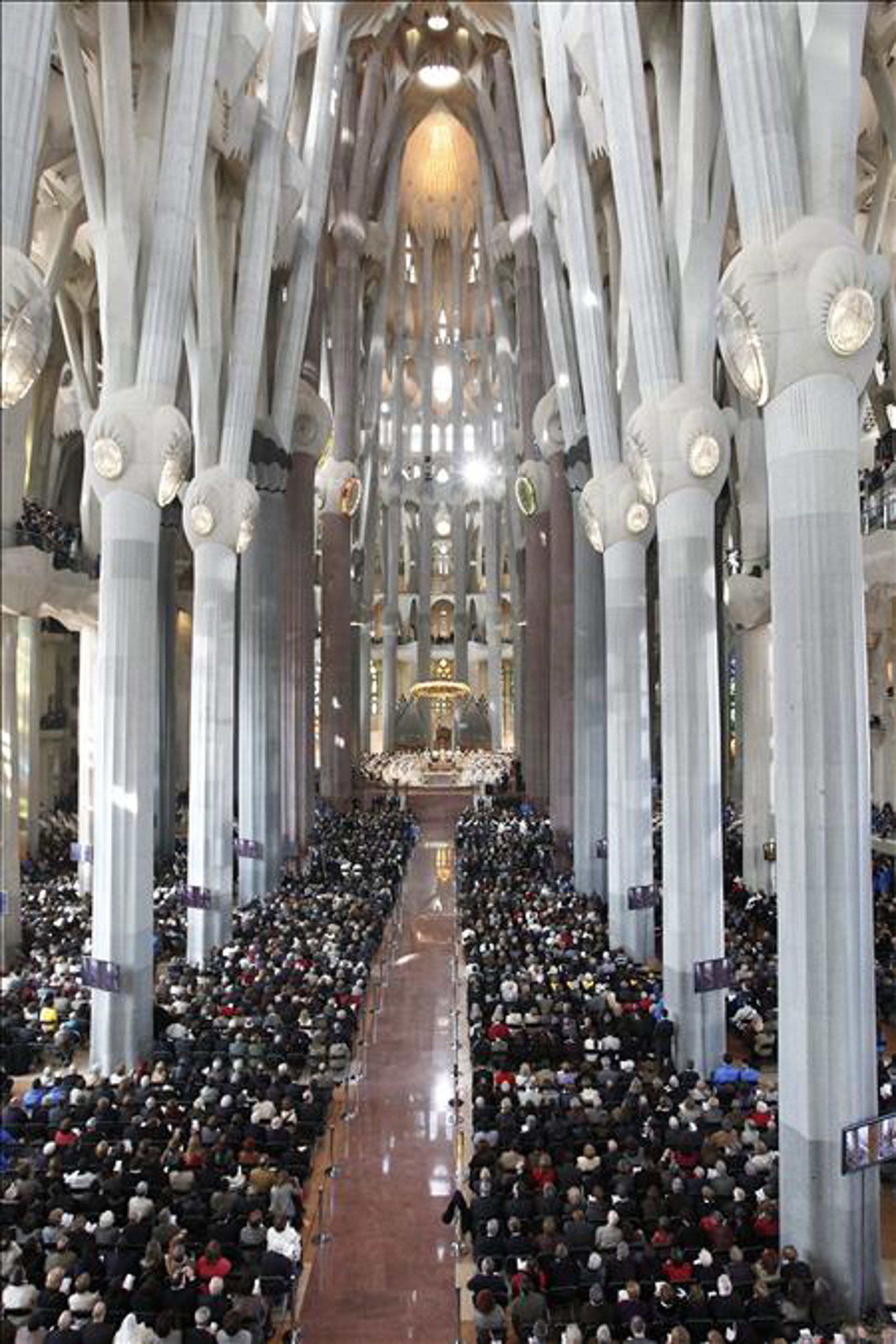 La Sagrada Familia de Barcelona se ha quedado pequeña en su primera celebración del Domingo de Ramos como Basílica, y en la que ha debutado acogiendo la eucaristía de este día en el interior de la construcción.