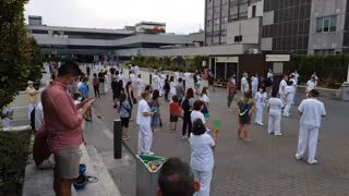 Asimismo, un grupo de personas se ha congregado también ante el hospital de La Paz, en Madrid, con dos minutos de silencio inicial en recuerdo de las víctimas de la pandemia. Entre el homenaje y los aplausos, las enfermeras Ainara Morollón y Laura Magán, portavoces de 'Sanitarios Necesarios', han leído un comunicado en el que se explicaba que "los recortes y las privatizaciones han mermado" el sistema de salud.