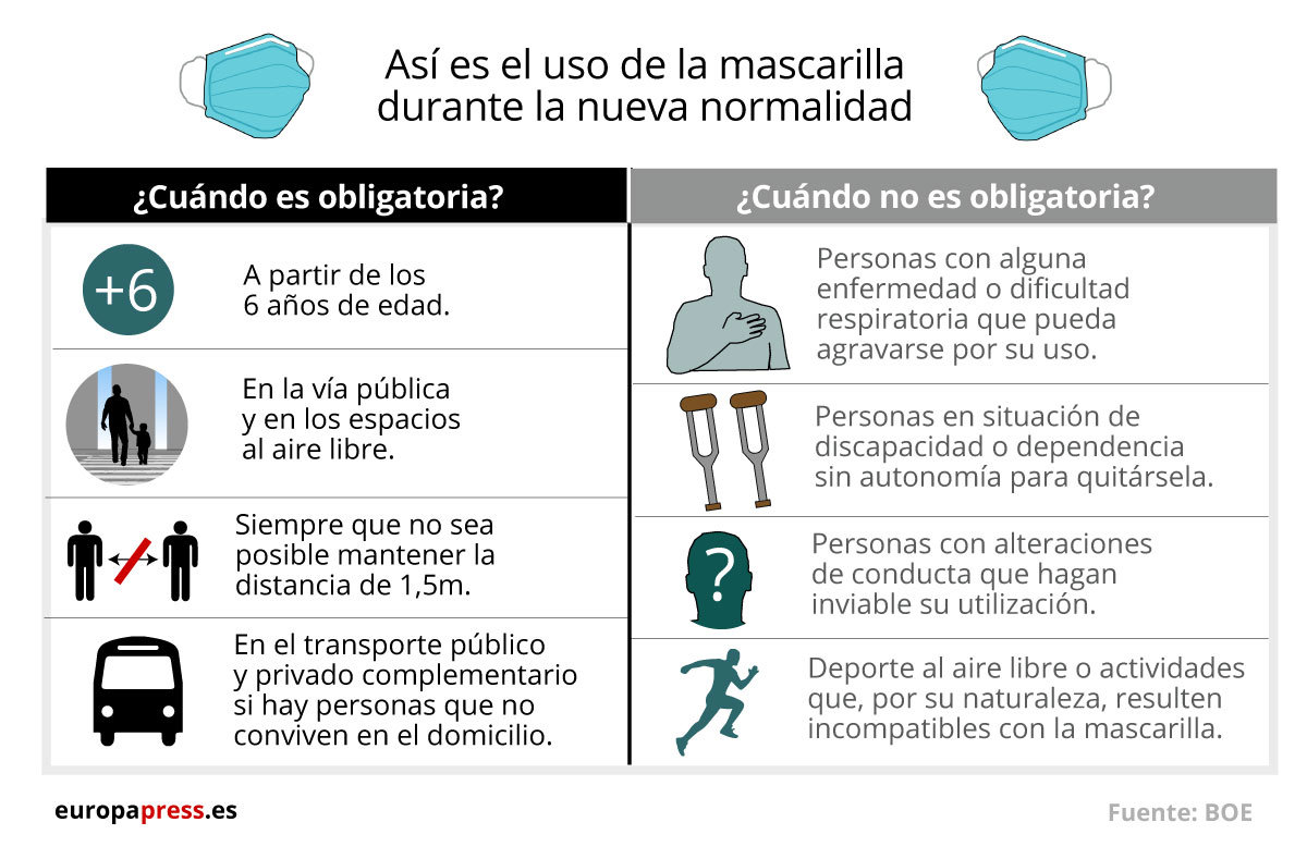 Por lo tanto durante la fase de "nueva normalidad" las personas mayores de seis años estarán obligadas a usar mascarillas en "vía pública, en espacios al aire libre y en cualquier espacio cerrado de uso público o que se encuentre abierto al público", siempre que no sea posible mantener la distancia de seguridad de 1,5 metros, según indica la orden ministerial publicada por el Boletín Oficial del Estado (BOE) el pasado 10 de junio.