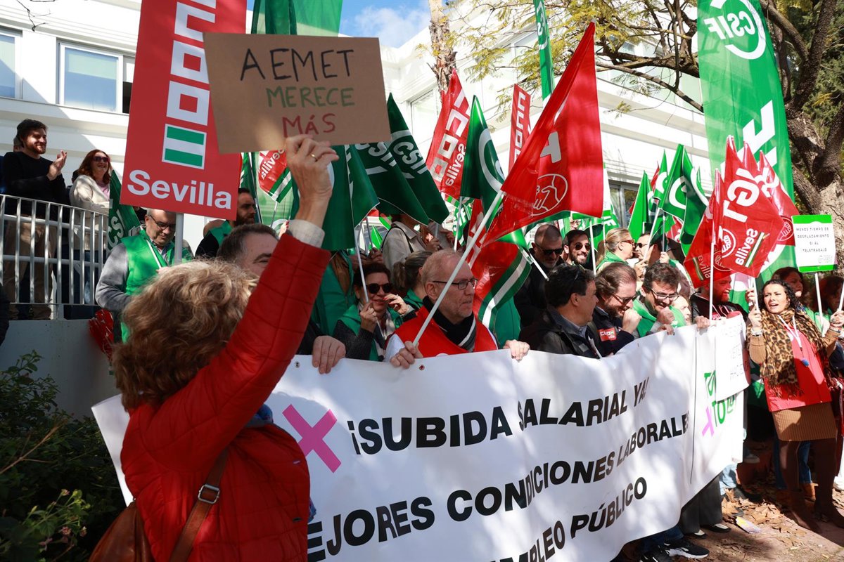 Miembros de la plantilla de la Agencia Estatal de Meteorología (Aemet) se concentra a las puertas de la delegación. A 19 de febrero de 2026, en Sevilla (Andalucía, España). - Rocío Ruz - Europa Press