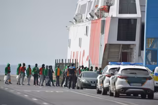 Inmigrantes hacen cola para subir al barco en el que serán trasladados a Tenerife, a 7 de octubre de 2023, en El Hierro, Islas Canarias (España). - Europa Press
