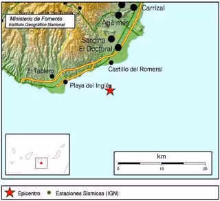 El movimiento se ha localizado en el municipio de Agüimes aunque el epicentro se ha producido en las cercanías de la playa del Inglés, en San Bartolomé de Tirajana, a unos diez kilómetros de la costa y a unos 30 metros de profundidad.
