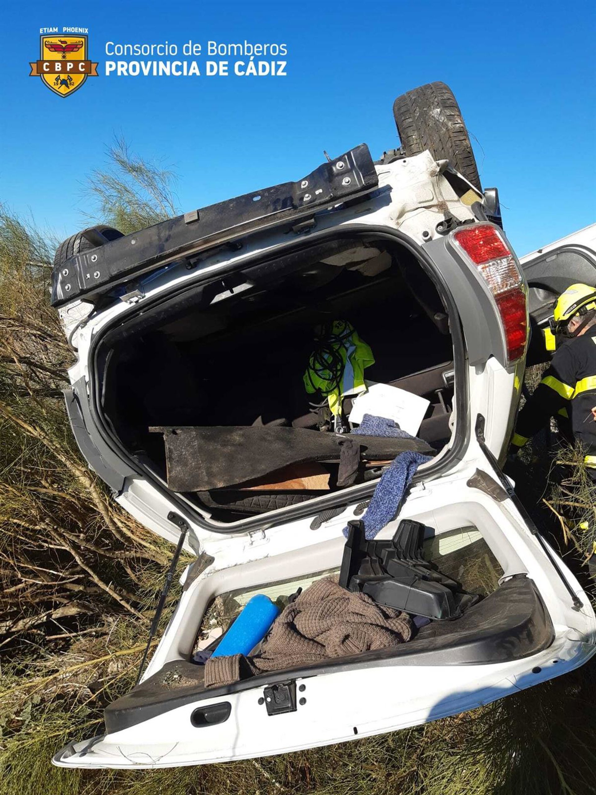 El taxi Toyota volcado en el accidente de tráfico entre dos vehículos en la AP-4 en Jerez de la Frontera (Cádiz) - CONSORCIO DE BOMBEROS PROVINCIA DE CÁDIZ