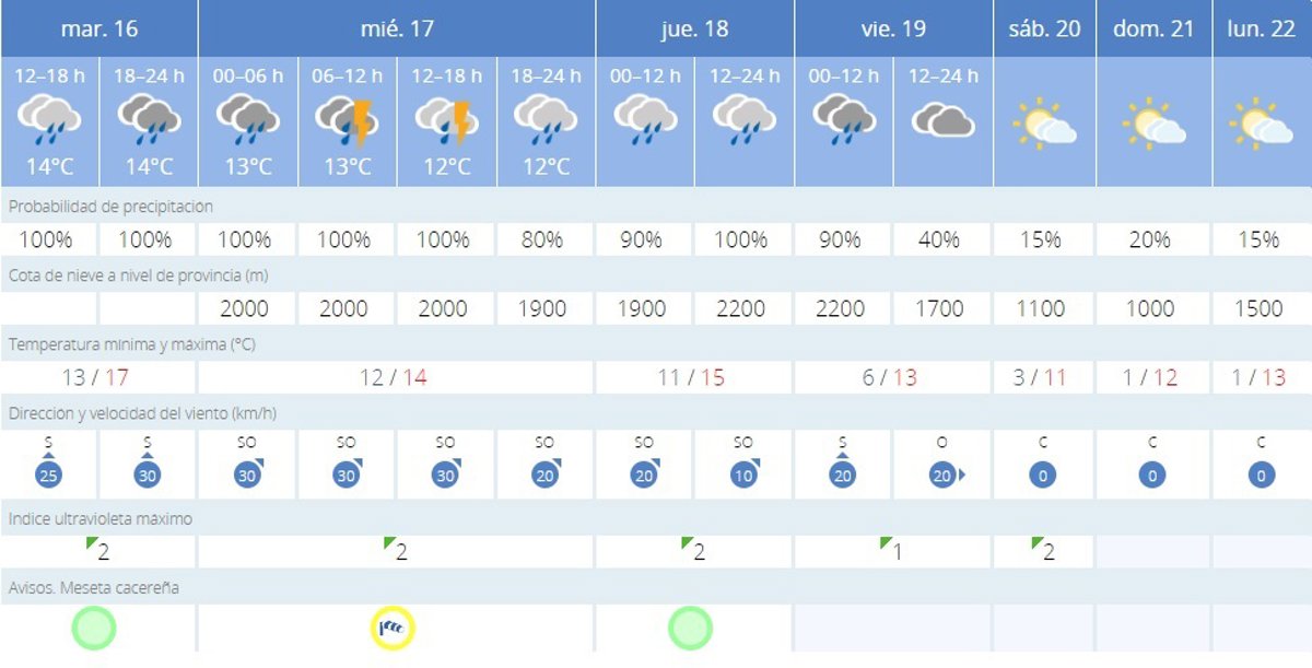 La predicción meteorológica para Cáceres del 16 de enero de 2024, proporcionada por la Agencia Estatal de Meteorología (AEMET), indica un día con cambios significativos en las condiciones del tiempo. Durante la primera mitad del día, no se espera precipitación. Sin embargo, a partir del mediodía, la probabilidad de lluvia aumenta a un 100%, manteniéndose así durante el resto del día.