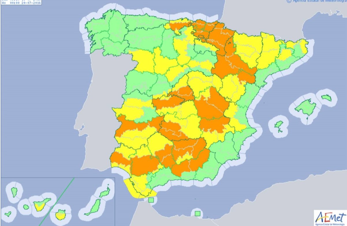 Las provincias que están en aviso por alerta naranja y que registrarán máximas de hasta 41 grados son: Córdoba, Granada, Huelva, Jaén, Sevilla, Teruel, Zaragoza, Cantabria, Albacete, Ciudad Real, Cuenca, Toledo, Burgos, Madrid, Navarra, Badajoz, Álava, Vizcaya y Guipúzcoa.