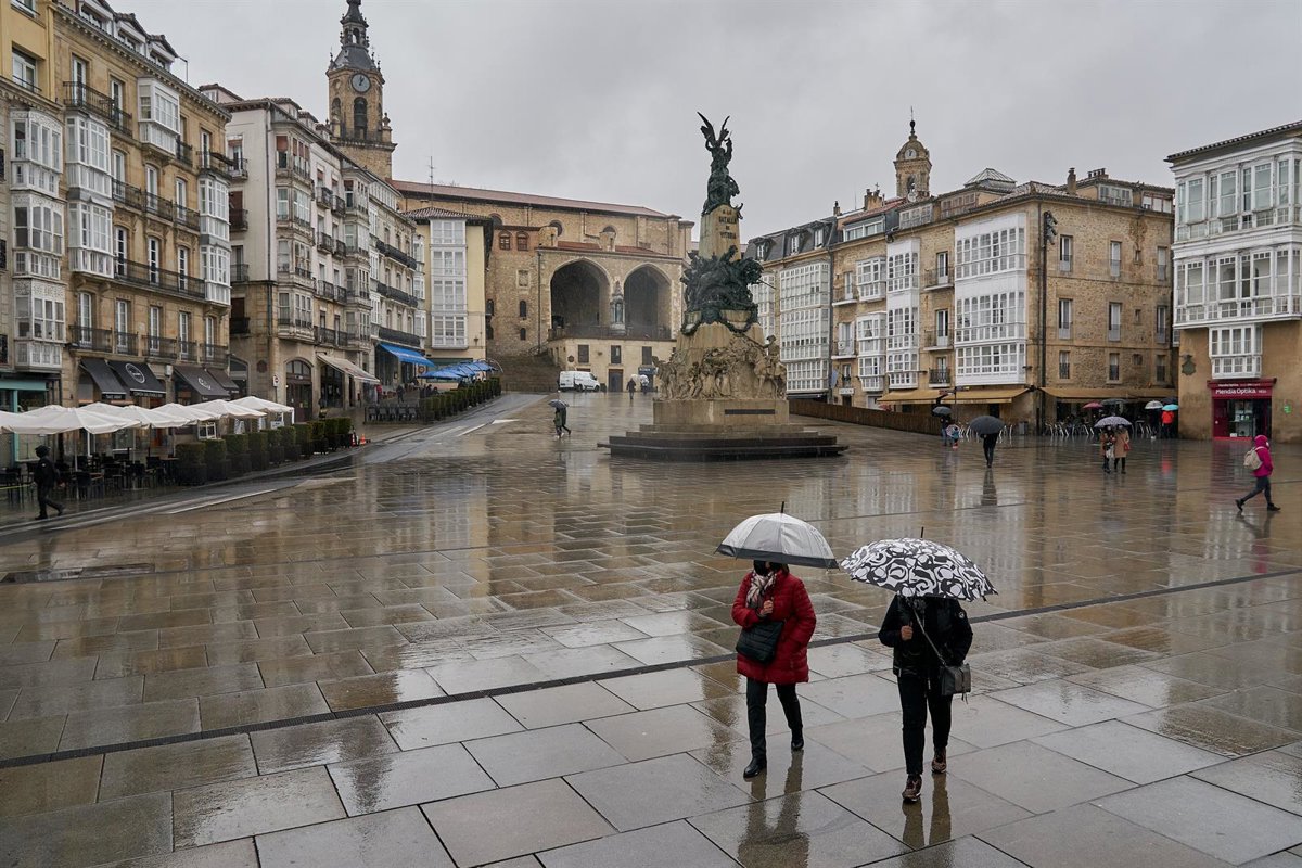 Archivo - Dos personas se refugian con un paraguas de la lluvia en Vitoria - Pablo González - Europa Press - Archivo