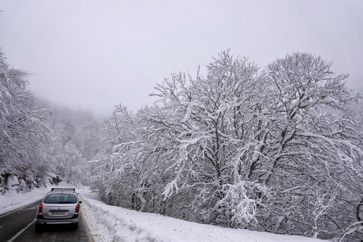 Un vehículo sube por la carretera N-625 al Puerto del Pontón de León, a 28 de enero de 2022, en el puerto del Pontón, León, Castilla y León (España). La provincia de León se encuentra en alerta por nevadas, que podrían alcanzar hasta los diez centímetro - Xuan Cueto - Europa Press